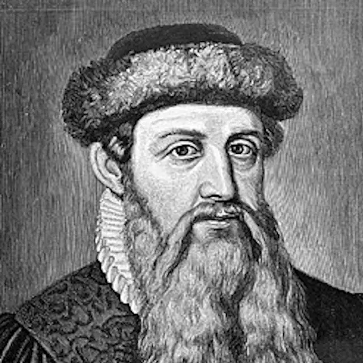 A German inventor and craftsman who invented the movable-type printing press. Though movable type was already in use in East Asia, Gutenberg’s invention of the printing press enabled a much faster rate of printing.